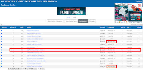 7º fin de semana consecutivo de travesías y 12º de los últimos 13. Donde con esta prueba, alcanzo las 21 travesías a nado esta Temporada; alcanzando los 20 pódiums (11 Oros – 6 Platas – 3 Bronces), quedándome solo una vez fuera del cajón, en el 3.000m de la Trav del Cubillas, donde fui 5º absoluto, en una prueba sin categorías, solo con clasificación general.